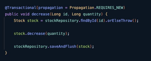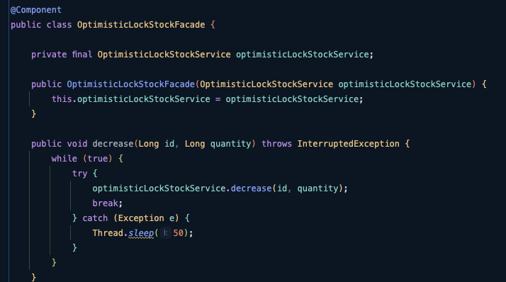 마찬가지로 stock의 id와 감소시킬 수량을 매개변수로 가지는 decrease메서드를 추가해 주고 optimisticLockService의 decrease메서드를 호출해 준다. 업데이트를 실패했을 땐 재시도를 해야 하기 때문에 while문으로 감싸주어 실패 시 50ms후에 재시도를 시켜준다.