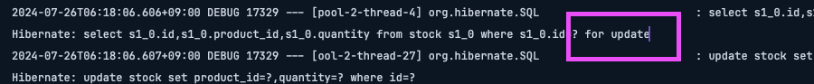 | {id : 1, quantity : 4, version: 2 } | update quantity = 4, version = version + 1 from stock where id = 1 and version = 1 FAIL |