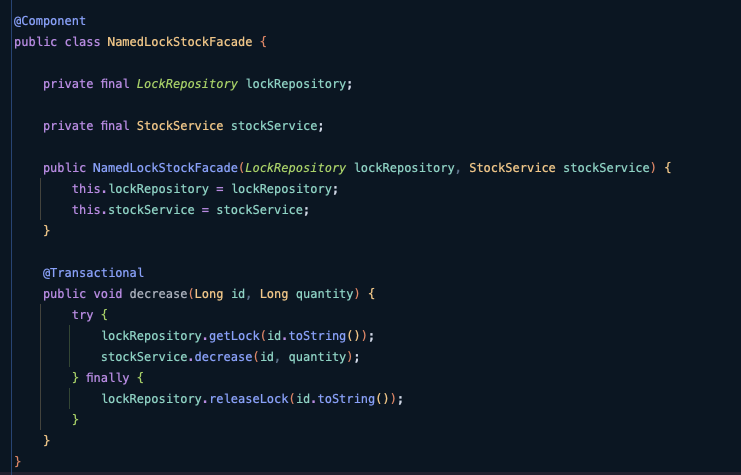 비관적락에선 stock에 대해서 lock을 걸었다면 named-lock은 stock에 락을 걸지 않고 별도의 공간에 lock을 걸게 되는 것이다.