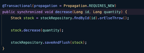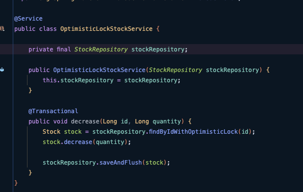마찬가지로 stock의 id와 감소시킬 수량을 매개변수로 가지는 decrease메서드를 추가해 주고 optimisticLockService의 decrease메서드를 호출해 준다. 업데이트를 실패했을 땐 재시도를 해야 하기 때문에 while문으로 감싸주어 실패 시 50ms후에 재시도를 시켜준다.